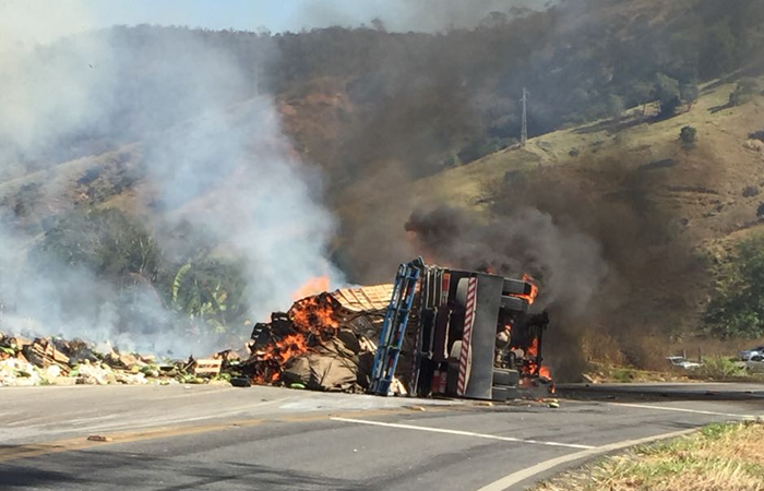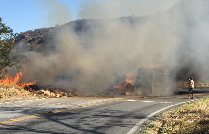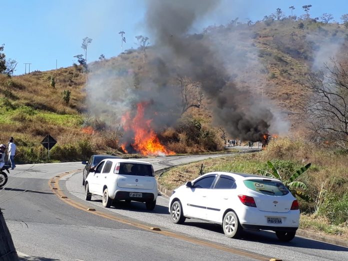 O fogo chegou a atingir a vegetação seca às margens da rodovia, que foi controlado pelos Bombeiros. O trânsito de veículos ficou bloqueado nos dois sentidos até a liberação da pista pela Polícia Rodoviária.