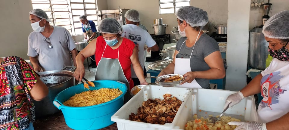 É obrigatório o uso de máscaras ao chegar no local para pegar o alimento. É feito também higienização nas mãos das pessoas que chegam para pegar a marmita.