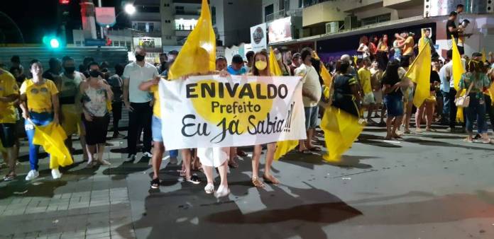 Foi assim que desde as 17h30 os aliados do deputado estadual Enivaldo dos Anjos já comemoravam a eleição, apesar de o candidato, propriamente, somente ter participado das comemorações a partir do momento em que a totalização paralela feita por sua equipe, somando os boletins de urnas, ultrapassou os 13 mil votos, com 70% das urnas totalizadas.