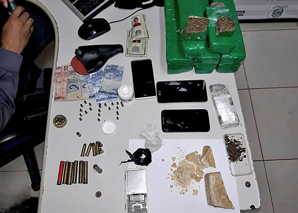 A Operação Policial realizada pela Equipe de Força Tática, juntamente com MMEE da 1ªCia/ 11ºBPM e do Serviço Reservado do 11ºBPM, totalizando 10 policiais e 04 viaturas, que se iniciou na tarde da última terça-feira (04.12) e se encerrou na tarde de quarta-feira (05.12), culminou com a apreensão de 5,062 Kg de maconha, 234 g de crack, 50 g cocaína, 01 bucha de maconha, 07 munições cal.36, 06 munições cal.38, 19 munições cal.22, 01 coldre, 01 balança de precisão, R$25,00 em espécie e 01 pote de ácido bórico e a prisão de 01 casal de traficantes, após o cumprimento de Mandado de Busca e Apreensão expedido pelo Juiz da Comarca de Barra de São Francisco.