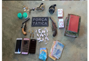 Durante as buscas foram apreendidas três armas de fogo, dentre elas uma pistola calibre 380; munições; 17 papelotes de cocaína; 15 buchas de maconha; oito pedras de crack; duas balanças de precisão; R$ 397,00 em espécie e outros materiais.