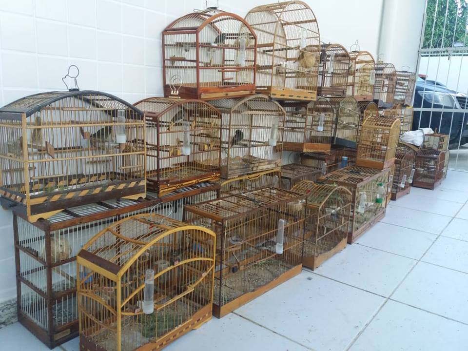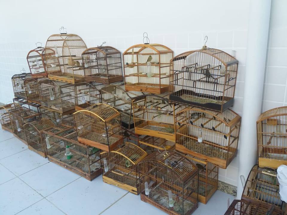 Na residência de W. M., de 33 anos, suspeito de participar ativamente do tráfico de entorpecentes local, os militares encontraram 33 gaiolas, 28 pássaros e 01 anilhador.