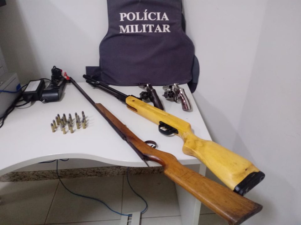 Policiais Militares do 11º Batalhão da Polícia Militar apreenderam 03 armas de fogo e uma espingarda de pressão, durante o atendimento de uma ocorrência de ameaça, no bairro Nova Barra, em Barra de São Francisco, nesta segunda-feira (24).
