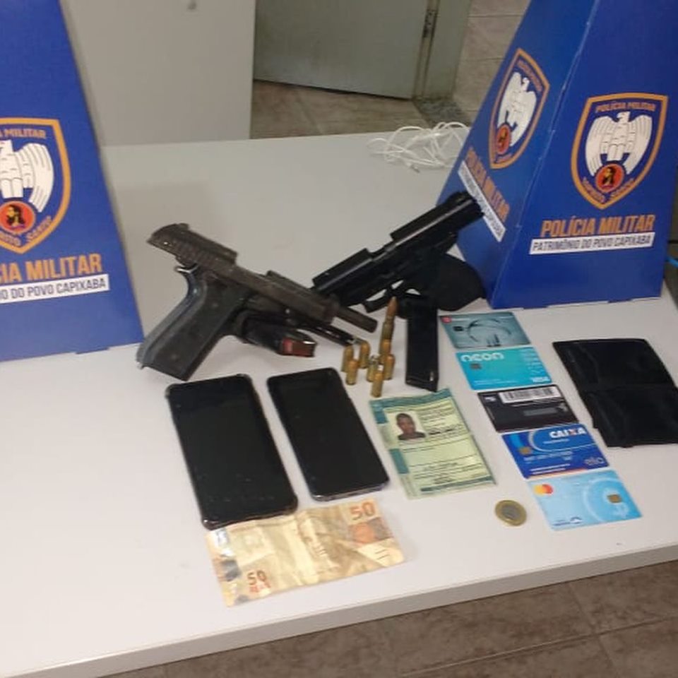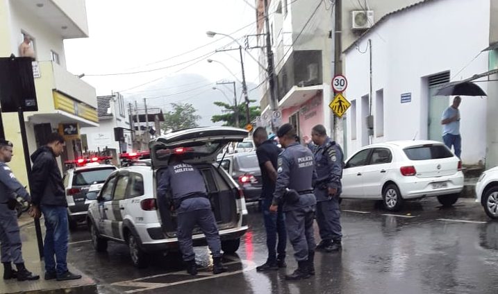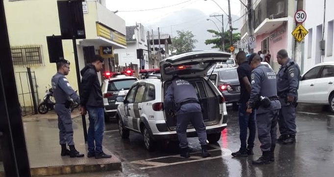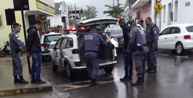 Diante das informações as guarnições prosseguiram aos Correios, localizado no centro do município, e encontraram J. K. R. O. de 18 anos na recepção com um simulacro e na parte interna do balcão estava A. A. C. de 25 anos armado com uma pistola calibre .40, com numeração raspada.