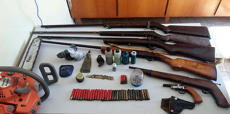 Foram apreendidas seis armas e outros materiais, sendo: uma garrucha Rossi Cal. 22, uma Espingarda boito Cal. 36, três espingardas de fabricação caseira, uma garrucha de fabricação artesanal, 24 munições cal. 22 (sendo 20 intactas e 4 deflagradas), 35 cartuchos cal. 36 (sendo duas intactas e 33 deflagradas, dois potes de espoleta, um pote contendo várias esferas, quatro potes de pólvora, um frasco de chumbo, um coldre de couro e um motosserra.