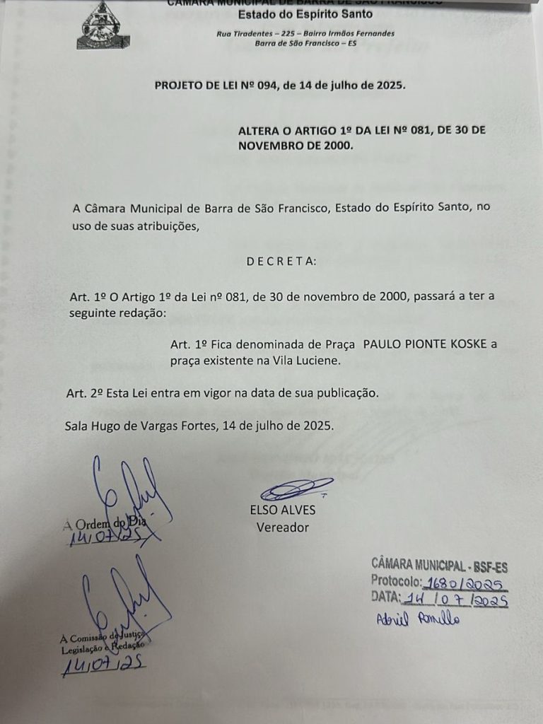 A Câmara Municipal de Barra de São Francisco aprovou, na sessão desta segunda-feira (15), o Projeto de Lei nº 094/2025, de autoria do vereador Elso Alves, que altera a denominação da praça localizada no bairro Vila Luciene. A partir de agora, o espaço passa a se chamar Praça Paulo Pionte Koske, em homenagem a um dos fundadores do bairro e comerciante local que marcou a história da comunidade.