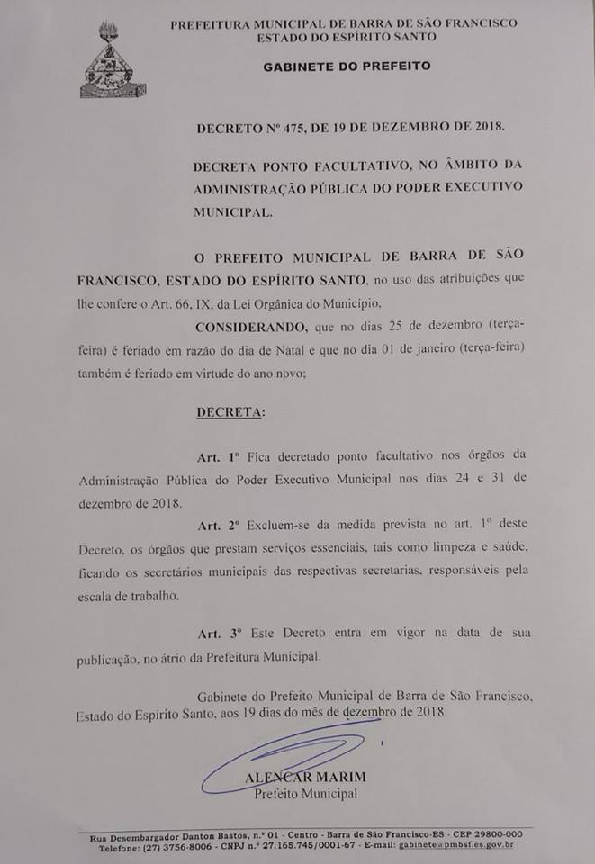 Através do Decreto de nº 475, de 19 de Dezembro deste ano de 2018, fica Decretado Ponto Facultativo no âmbito da Administração Pública do Poder Executivo Municipal nos dias 24 e 31 de dezembro de 2018.