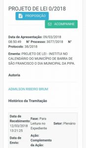 Virou motivo de chacota nas redes sociais o Projeto de Lei nº 3077/2018 do vereador Admilson Ribeiro Brum, por meio do qual institui no Município de Barra de São Francisco/ES o Dia Municipal da Pipa. O projeto do vereador virou tema nos botecos, filas de banco, em papos de lavadeiras, velórios, horários de cafezinho em empresas, onde quer que tenha mais de duas pessoas.
