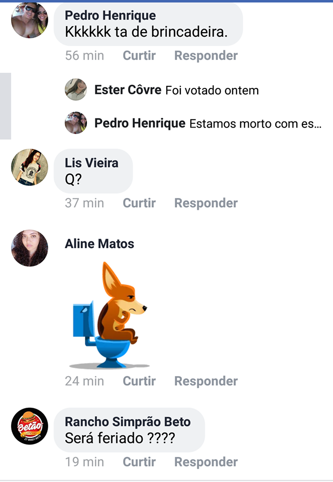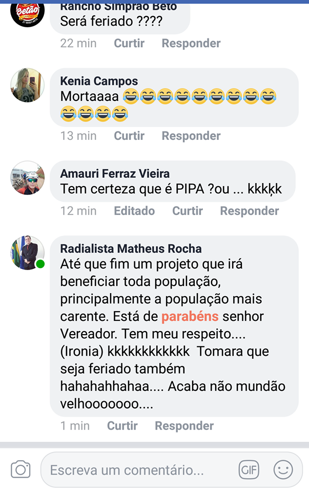 “Não sei se Excelentíssimo vereador estava voando, fora do planeta ou soltando pipa no momento em que teve a ideia de apresentar esse Projeto de Lei inútil. Mas sei, porém, que em um momento de tantas dificuldades e a grave crise financeira que assola o país, não era o momento para a proposição de um projeto tão descabido”, disse um cidadão abordado.